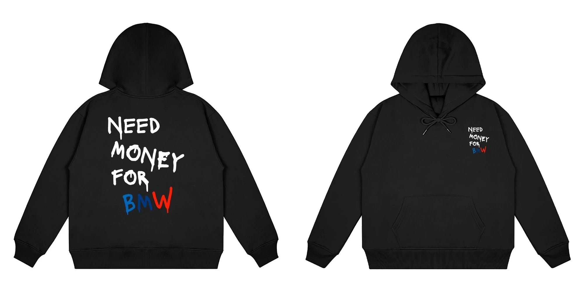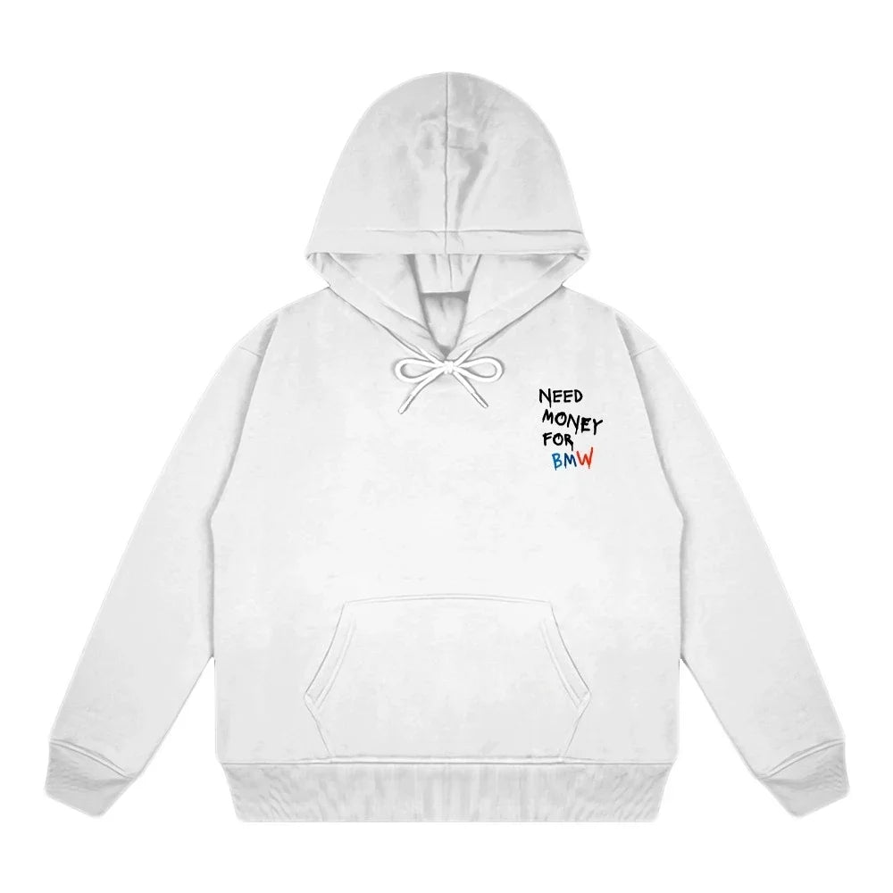 Product Description: "NEED MONEY FOR BMW" 🏎️💨 will provide you with a challenging and inspiring daily adventure this autumn and winter. With its bold and daring style from ReidUnlimited, this knit sweatshirt is perfect for the risk-takers, both men and women. Made with high-quality materials and no harmful chemicals, the fleece thickness will keep you warm while the hooded design adds a touch of street fashion. Don't wait for a full opening, grab this regular fit sweatshirt now and add some thrill to your wardrobe!
